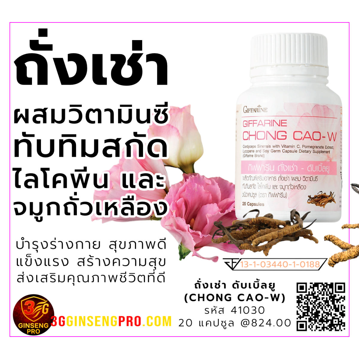 มั่นใจในคุณภาพ ความปลอดภัยในถั่งเช่าของกิฟฟารีน ถั่งเช่า ผสมวิตามินซี ทับทิมสกัด ไลโคพีน และจมูกถั่วเหลือง