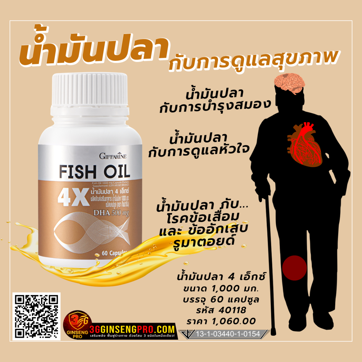 • น้ำมันปลาคือเกราะป้องกันภาวะสมองเสื่อมที่ทรงพลังที่สุด ชะลอความเสื่อมของสมอง หรือโรคอัลไซเมอร์ และบรรเทาอาการของโรคเรื้อรังต่าง ๆ เช่น โรคข้อเสื่อม โรคเบาหวาน ให้คุณยังคงใช้ชีวิตได้อย่างมีคุณภาพเป็นต้น